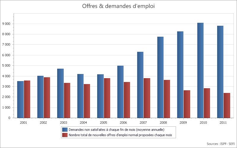 Entre 2002 et 2007, le nombre de chômeurs (12 700, au sens du recensement de la population) a augmenté au même rythme que la population active, d'où un taux de chômage qui reste stable à 11,7 % entre les deux dates. En 2007, le commerce et les services marchands et non marchands concentrent 75 % des actifs ayant un emploi. Les activités touristiques sont particulièrement développées aux îles Sous-le-Vent. Le secteur primaire reste une activité importante employant 8 800 personnes (9 % des actifs ayant un emploi) particulièrement développée dans les archipels éloignés. La moitié des 6 700 emplois de l’industrie se concentre dans les industries agricoles et alimentaires, la production de matériaux et d’énergie et l’imprimerie. L’artisanat (travail du bois, fabrication de meubles, textile et habillement) représente 30 % des postes de l’industrie.