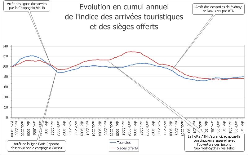 Evolution en cumul annuel de l'indice des arrivées touristiques et des sièges offerts
